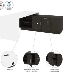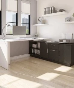 Transform your office into a center of organization and productivity with the Bestar Equinox L-Shaped Office Desk. With a layered work surface, this L-shaped desk provides ample room for all of your work activities. The laminated particle board desktop resists scratches, stains, and wear to last you for many years. With 2 closed and 2 open storage areas and a total of 3 adjustable shelves, the desk offers enough storage solutions for your office accessories. Easily keep your files and folders organized thanks to the utility drawer and letter/legal file drawer. The grommet can help you efficiently manage your cables. Keep your phone charged and on hand thanks to the built-in USB/power socket on the desktop. Meets ANSI/BIFMA standards for safety and performance. T