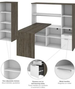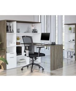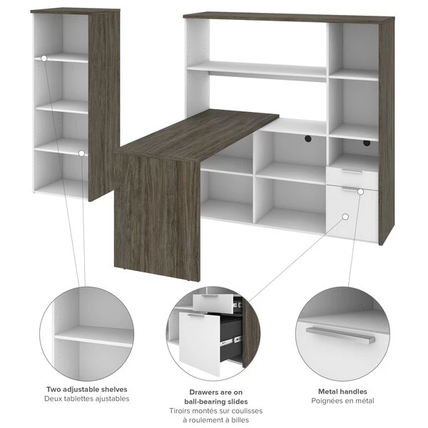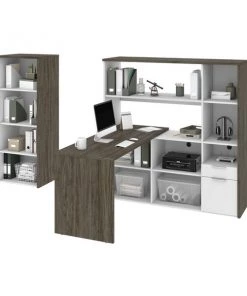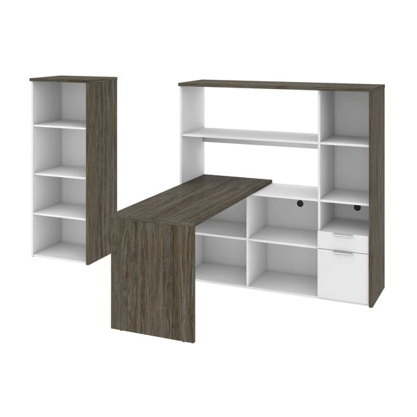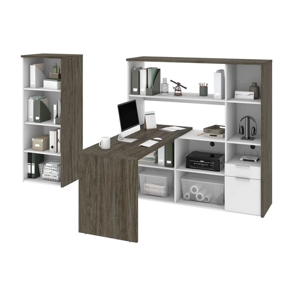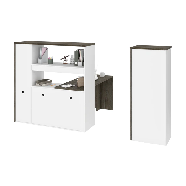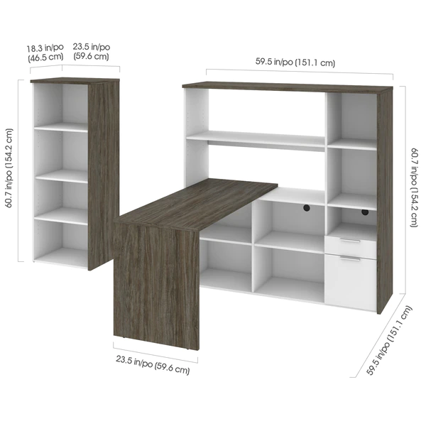 This collection is the perfect addition to your home office or workplace. Each piece in this collection provides storage options to create an organized and cohesive workspace. The abundant storage options help you stay organized and productive, without compromising the style of your office. The simple crisp lines of this collection add an elegant and modern feel to your space to create both an organized and stylish office. Desk: 59.5" W x 59.5" D x 60.7" H. This modern L-shaped desk with hutch keeps everything close at hand, but neatly put away thanks to the abundant storage provided. Durable 1" commercial grade top surface with melamine finish that resists scratches, stains and wear. Meets or exceeds ANSI/BIFMA safety and performance standards. Silver-painted steel handles. Keep your workspace tidy and organized thanks to 9 open storage areas in the credenza and hutch. The utility drawer and the legal/letter file drawer on ball-bearing slides. Finished back. Hutch: 59.5" W x " D x 60.7" H. Return table 59.5" W x 23.4" D x 29.7" H. Made from laminated, high-density commercial-grade particle board, compliant with Carb phase 2. Bookcase: 23.4" W x 14.5" D x 60.7" H. This modern bookcase is made from laminated, high-density commercial-grade particle board, compliant with Carb phase 2. Meets or exceeds ANSI/BIFMA safety and performance standards. The bookcase offers 4 open storage compartments to keep your room clutter-free. 2 fixed shelves and 2 adjustable shelves to maximize your storage options. Each shelf, including the top of the bookcase, can support up to 25 lb of distributed weight. Finished back.