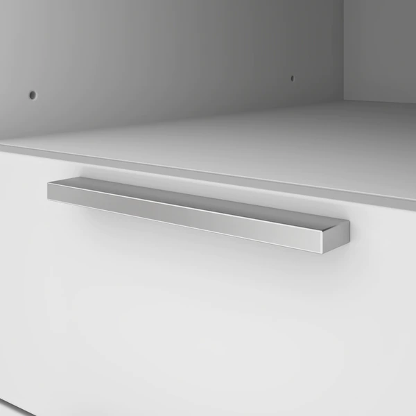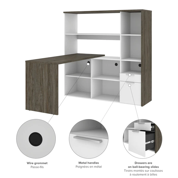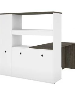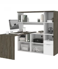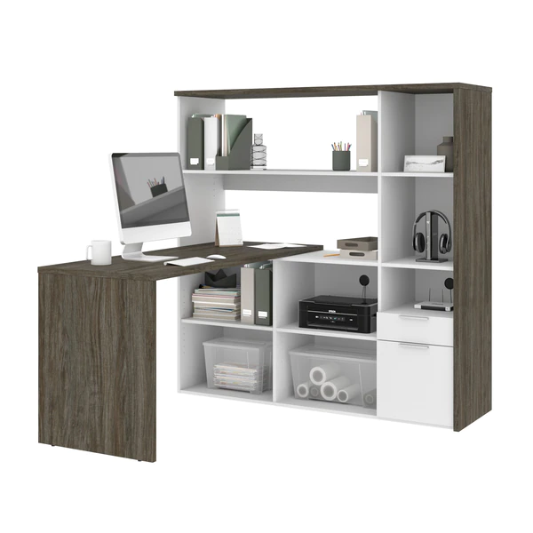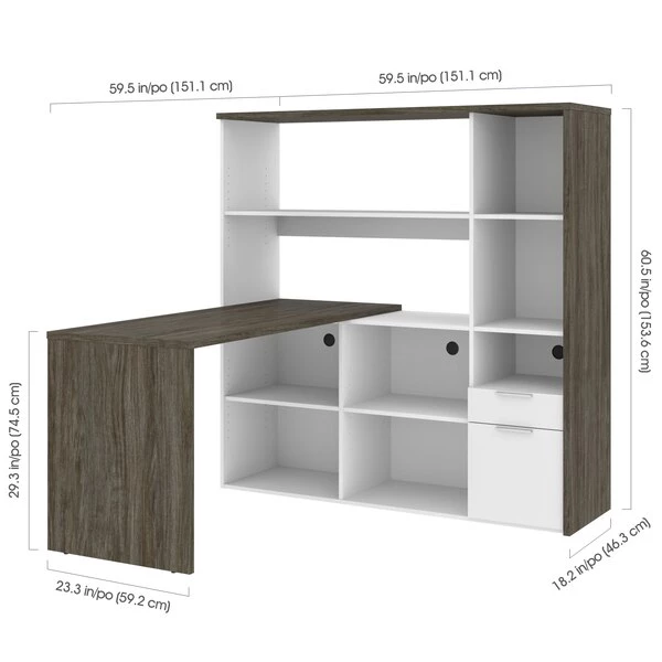 This two-tone collection is the perfect addition to your home office or workplace. Each piece in this collection provides storage options to create an organized and cohesive workspace. The abundant storage options help you stay organized and productive, without compromising the style of your office. The simple crisp lines of this collection add an elegant and modern feel to your space to create both an organized and stylish office. This modern two-tone L-shaped desk with hutch keeps everything close at hand, but neatly put away thanks to the abundant storage provided. Made from laminated, high-density commercial-grade particle board, compliant with Carb phase 2. Durable 1" commercial grade top surface with melamine finish that resists scratches, stains and wear. Meets or exceeds ANSI/BIFMA safety and performance standards. Silver-painted steel handles. Keep your workspace tidy and organized thanks to 9 open storage areas in the credenza and hutch. The utility drawer and the legal/letter file drawer on ball-bearing slides. Finished back. Hutch: 59.5” W x ” D x 60.7” H. Return table 59.5” W x 23.4” D x 29.7” H.
