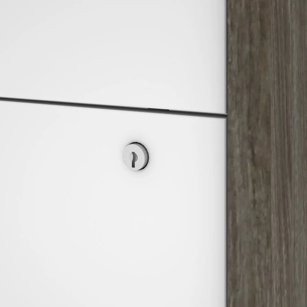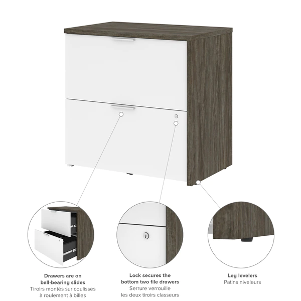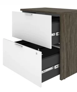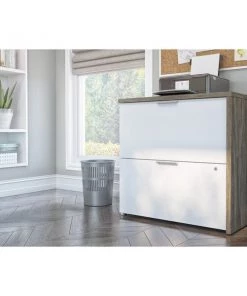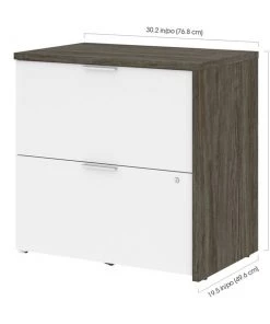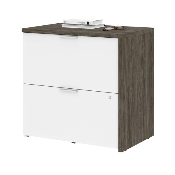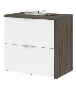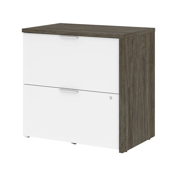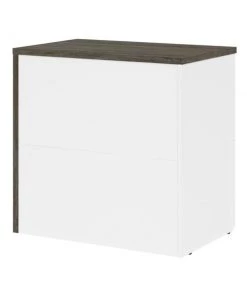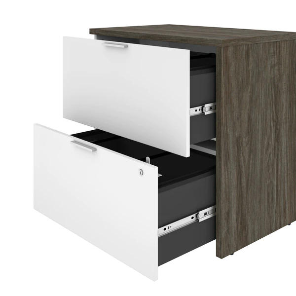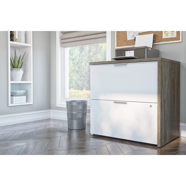 This two-tone collection is the perfect addition to your home office or workplace. Each piece in this collection provides storage options to create an organized and cohesive workspace. The abundant storage options help you stay organized and productive, without compromising the style of your office. The simple crisp lines of this collection add an elegant and modern feel to your space to create both an organized and stylish office. This two-tone modern lateral file cabinet is made from laminated, high-density commercial-grade particle board, compliant with Carb phase 2. Durable 1" commercial grade top surface with melamine finish that resists scratches, stains and wear. Meets or exceeds ANSI/BIFMA safety and performance standards. 2 legal/letter file drawers on ball-bearing slides. One lock secures both drawers. Top surface can support up to 100 lb and the drawers up to 80 lb of distributed weight. Thanks to its finished back, the file cabinet can be placed in the middle of a room. Interior dimensions of drawers are 26.4” W x 15” D x 8.8” H. Silver-painted steel handles.