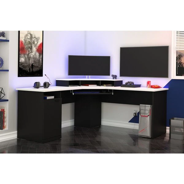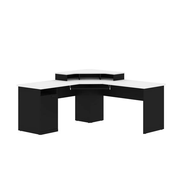 This unique corner design is ideal for creating a private workstation in a busy office or a gaming corner in your home. The sturdy and durable work surface resists the wear and tear from a busy workday or an intense gaming session. The large work surface easily accommodates up to 3 monitors, which makes the desk ideal for jobs that require multiple monitors or for gaming setups. The open and closed storage areas on the pedestal are perfect for storing office or gaming supplies of various sizes. The keyboard tray frees up the work surface and helps you work from a comfortable position. The large wings and deep center unit ensure that you have ample space for your monitors.