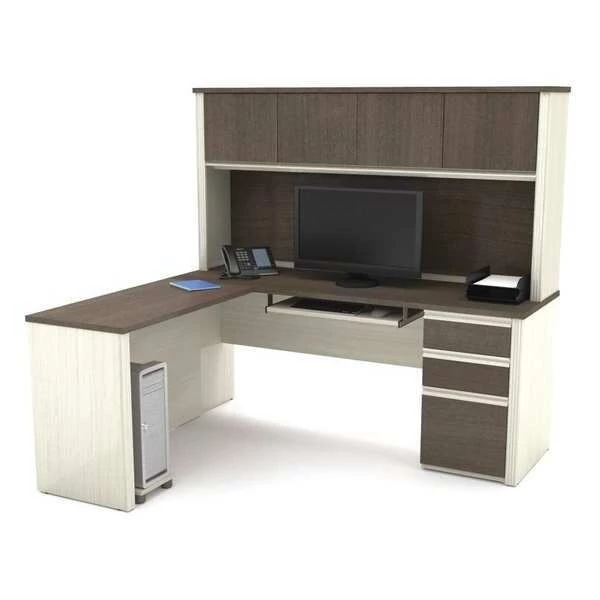 L-Shape Workstation, Prestige + Series, Overall Width 71 7/64 in, Overall Height 66 13/16 in, Overall Depth 62 13/16 in, Number of Pedestals 1, Pedestal Location Reversible, Number of Drawers 3, Pedestal Style Full, Keyboard Shelf Yes, Color Base White/Chocolate, Color Top Chocolate, Base Material Melamine, Top Material Melamine, Recessed Handle, Assembly Required, Standards ANSI/BIFMA, Includes (2) Utility Drawers, File Drawer