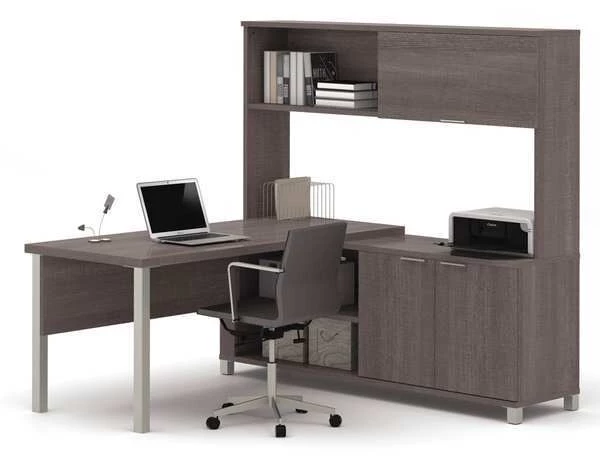 L-Shape Workstation, Pro-Linea Series, Overall Width 71 7/64 in, Overall Height 68 3/4 in, Overall Depth 71 7/64 in, Number of Pedestals 0, Number of Drawers 0, Keyboard Shelf No, Color Base Bark Gray, Color Top Bark Gray, Base Material Melamine, Top Material Melamine, Metal Pull Handle, Assembly Required, Standards ANSI/BIFMA, Includes (3) Shelves, 10 yr Warranty, Adjustable Doors, Credenza, Fully Reversible, Hutch, Levelers, Pvc Edge, Return Table, Sliding Door, Square Metal Legs