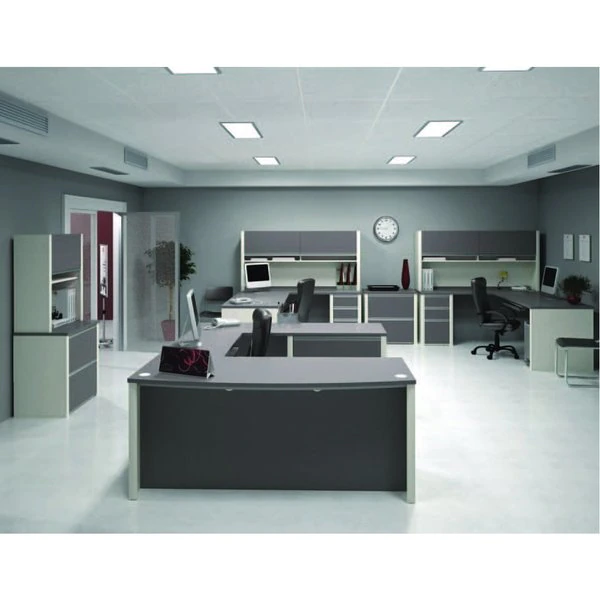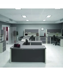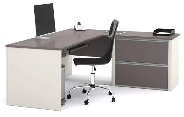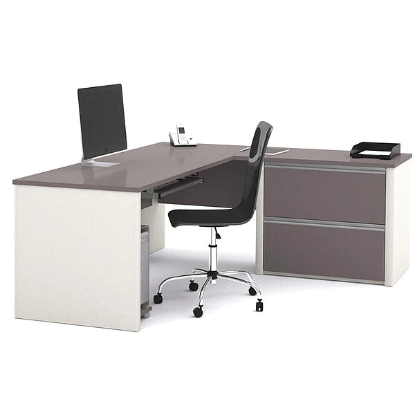 L-Shape Workstation, Connexion Series, Overall Width 82 3/4 in, Overall Height 30 3/8 in, Overall Depth 71 in, Number of Pedestals 1, Pedestal Location Reversible, Number of Drawers 2, Pedestal Style Full Oversized, Keyboard Shelf Yes, Color Base Slate/Sandstone, Color Top Slate/Sandstone, Base Material Melamine, Top Material Melamine, Recessed Handle, Assembly Required, Standards ANSI/BIFMA, Includes (2) File Drawers in Oversized File Pedestal, CPU Platform, Grommets, Return Table