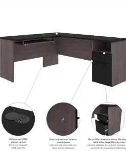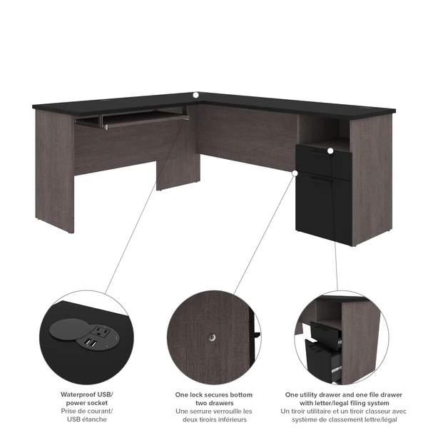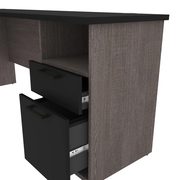The Norma Collection is ideal for any type of office. You can easily arrange the pieces in this collection to fit your needs by adding a desk shell or a hutch. Keep your space organized with the multiple storage options. Not only will your space be clutter-free, it will also feel modern and stylish thanks to the two-tone design and the metal handles with black finish. Enhance your space with this affordable collection! 1" thick work surface with a melamine finish that resists scratches, stains and wear. 1 utility drawer, 1 file drawer with letter/legal filing system, 1 open storage area and one 3⁄4 extension keyboard tray. One lock sucures the two drawers. Drawers and keyboard shelf on ball-bearing slides for smooth operation. Ample work surface equipped with a waterproof outlet for 2 USB ports and 1 power socket. 2 grommets for efficient wire management. Finished back. Levelers to adapt to any floor irregularities. PVC edges. Made of laminated, high-density commercial-grade particle board, compliant with Carb phase 2. Meets or exceeds ANSI/BIFMA safety and performance standards. Fully reversible unit. Desk surface supports up to 100 lb, utility drawer up to 15 lb, keyboard tray, file drawer, and open storage area (14′′ W x 7.5′′ H x 17.3′′ D) up to 25 lb.