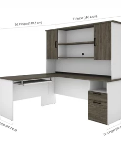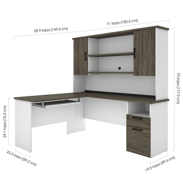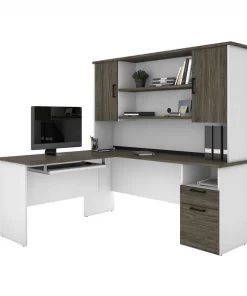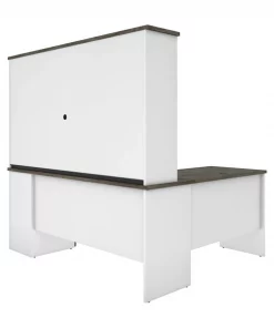The Norma Collection is ideal for any type of office. You can easily arrange the pieces in this collection to fit your needs by adding a desk shell or a hutch. Keep your space organized with the multiple storage options. Not only will your space be clutter-free, it will also feel modern and stylish thanks to the two-tone design and the metal handles with black finish. Enhance your space with this affordable collection! 1" thick work surface with a melamine finish that resists scratches, stains and wear. 1 utility drawer, 1 file drawer with letter/legal filing system, 1 open storage area and one 3⁄4 extension keyboard tray. One lock sucures the two drawers. Drawers and keyboard shelf on ball-bearing slides for smooth operation. Ample work surface equipped with a waterproof outlet for 2 USB ports and 1 power socket. 3 grommets and 1 rubber strip on the hutch for efficient wire management. The hutch features 1 open storage compartment (38.8′′ W x 25.3′′ H x 10.6′′ D) with 2 adjustable shelves and 1 adjustable shelf behind each of the 2 doors. The hutch has a rubber strip for efficient wire management. Finished back. Levelers to adapt to any floor irregularities. PVC edges. Made of laminated, high-density commercial-grade particle board, compliant with Carb phase 2. Meets or exceeds ANSI/BIFMA safety and performance standards. Fully reversible unit. Desk surface supports up to 100 lb, utility drawer up to 15 lb, keyboard tray, file drawer, and open storage area (14′′ W x 7.5′′ H x 17.3′′ D) up to 25 lb. The top of the hutch and each shelf in the open storage area can support up to 25 lb.