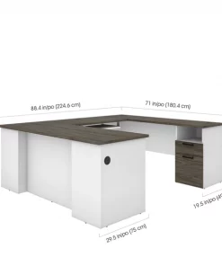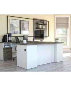 The Norma Collection is ideal for any type of office. You can easily arrange the pieces in this collection to fit your needs by adding a desk shell or a hutch. Keep your space organized with the multiple storage options. Not only will your space be clutter-free, it will also feel modern and stylish thanks to the two-tone design and the metal handles with black finish. Enhance your space with this affordable collection! 1" thick work surface with a melamine finish that resists scratches, stains and wear. 1 utility drawer, 1 file drawer with letter/legal filing system, 1 open storage area and one 3⁄4 extension keyboard tray. One lock sucures the two drawers. Drawers and keyboard shelf on ball-bearing slides for smooth operation. Ample work surface equipped with a waterproof outlet for 2 USB ports and 1 power socket. 4 grommets for efficient wire management. Finished back. Levelers to adapt to any floor irregularities. PVC edges. Made of laminated, high-density commercial-grade particle board, compliant with Carb phase 2. Meets or exceeds ANSI/BIFMA safety and performance standards. Fully reversible unit. Desk surface supports up to 100 lb, utility drawer up to 15 lb, keyboard tray, file drawer, and open storage area (14′′ W x 7.5′′ H x 17.3′′ D) up to 25 lb.