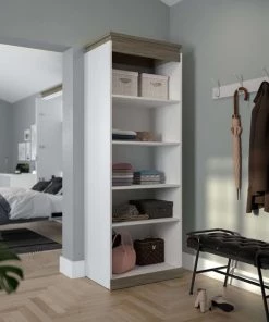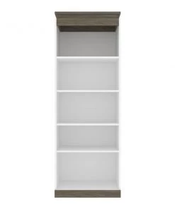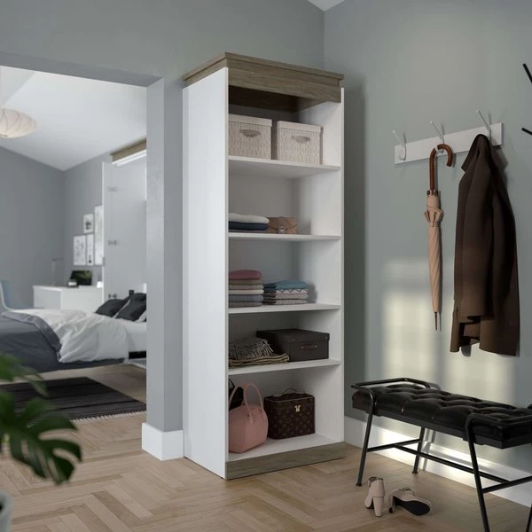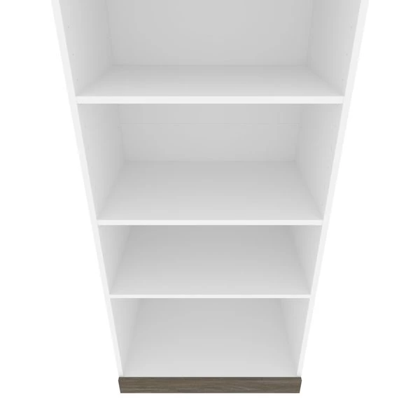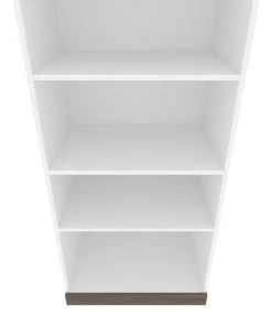 Keep your space organized with this contemporary Shelving Unit. With quality materials and 2 fixed shelves, this unit provides the utmost stability. The 3 adjustable shelves offer flexibility, allowing you to rearrange the unit to your liking. Each shelf can support up to 30 lb to keep your belongings safe. The elevated top is a unique design feature that adds flair to the shelving unit. The top has a weight capacity of up to 20 lb, meaning it can be used as an extra shelf. The unit coordinates beautifully with the Full or Queen Murphy Bed from the Orion collection (sold separately). Tested to meet ANSI/BIFMA quality standards for safety and performance.