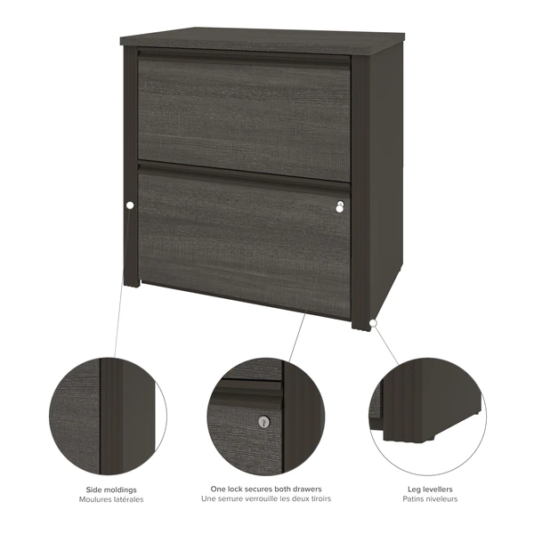 Prestige + is a timeless modular collection that will adapt to your needs, over time. With its wide range of products, it is ideal for every type of office. Durable 1" commercial grade surface with melamine finish that resist scratches, stains and wear. The Lateral File offers two file drawers with letter/legal filing system. Drawers on ball-bearing slides for smooth and quiet operation. One lock secures both drawers. Finished with classic moldings.