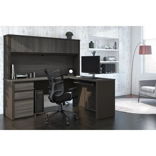 Prestige + is a timeless modular collection that will adapt to your needs, over time. With its wide range of products, it is ideal for every type of office. The desk is made of a durable 1" commercial grade work surface with melamine finish that resist scratches, stains and wear. It features an impact resistant thick PVC edge, a full modesty panel and classic moldings. Grommets are available on the desk for efficient wire management. The hutch, the credenza and the return table meet or exceed ANSI/BIFMA performance standards. The pedestal offers two utility drawers and one file drawer with letter/legal filing system. One lock secures bottom two drawers. The drawers and the keyboard shelf are on ball-bearing slides for a smooth and quiet operation. The hutch for credenza offers large closed storage space, efficient wire management and side moldings. The opening has 11'' 3/4 high which is ideal for letter format binders. The doors are fitted with strong adjustable hinges. The station is fully reversible.