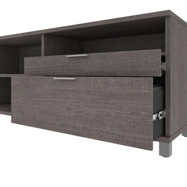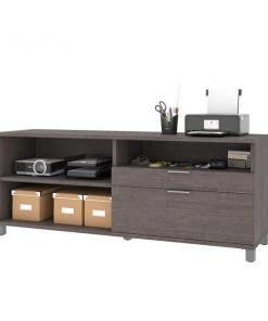 This Credenza is the perfect addition to any space. Specifically, your office will benefit from the additional storage. The drawers on ball-bearing slides offer space to conceal and organize your personal items and documents. With the shelves, you will be able to display your decorations, books, and pictures. This Credenza is