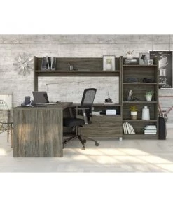 Pro-Linea has all the elements to create a modern and refined work environment. The clean lines of this collection bring a fresh look without compromising functionality and durability. The desk is made of a durable 1.5" commercial grade work surface with melamine finish that resists scratches, stains and wear. The Credenza is made of a durable 1" commercial grade work surface with melamine finish. Deluxe impact resistant PVC edge. The credenza features one utility drawer, one file drawer with letter/legal filing system and three shelves, one of which is adjustable for additional flexibility. Drawers on ball-bearing slides for smooth and quiet operation. The hutch for credenza offers large storage spaces. Square metal legs in matte silver finish. The Legs feature levelers to adapt to any floor irregularities. The workstation is fully reversible. The bookcase offers 3 adjustable shelves and 2 fixed shelves. This set meets or exceeds ANSI/BIFMA performance standards. Desk : 71.1'' (L) x 71.1'' (D) x 67.7". Bookcase : 29.9'' (L) x 12.6'' (D) x 67.7".