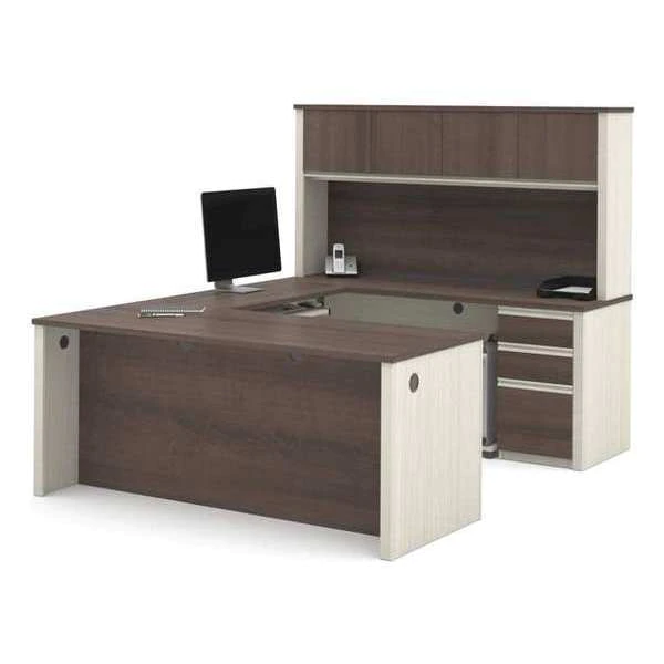U-Shape Workstation, Prestige + Series, Overall Width 71 7/64 in, Overall Height 66 13/16 in, Overall Depth 92 39/64 in, Number of Pedestals 2, Pedestal Location Left and Right, Number of Drawers 6, Pedestal Style Full, Keyboard Shelf Yes, Color Base White/Chocolate, Color Top Chocolate, Base Material Commercial Grade Particle Board, Top Material Melamine and Commercial Grade Particle Board, Recessed Handle, Assembly Required, Standards ANSI/BIFMA, Includes (2) Utility Drawers, File Drawer, Lock