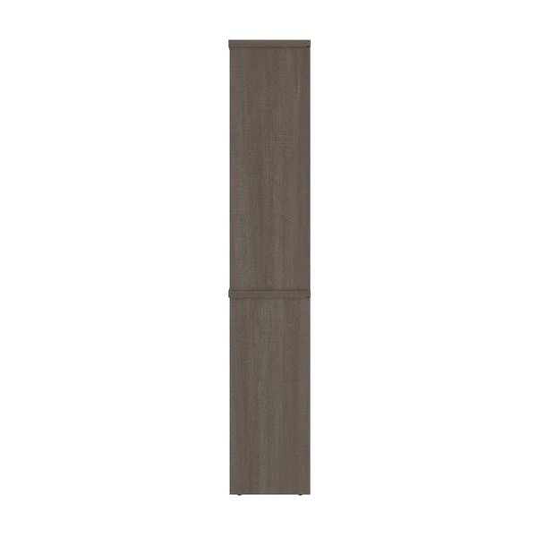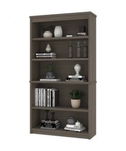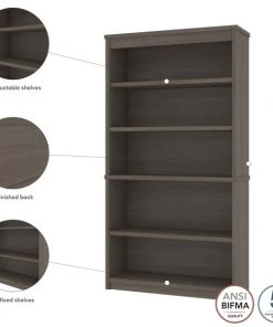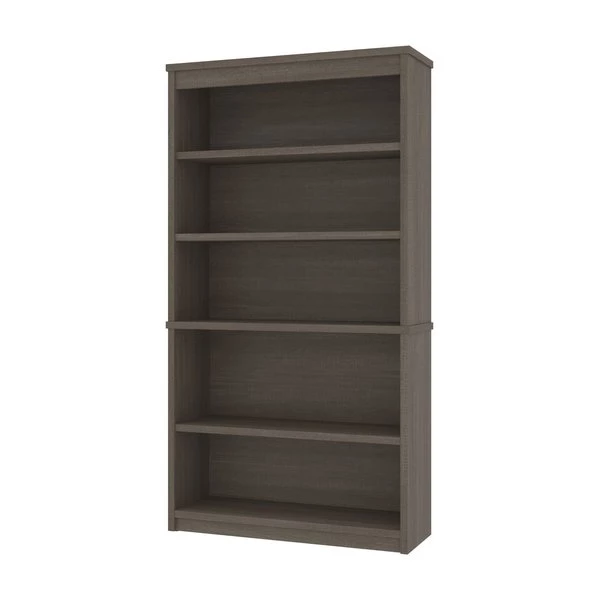 The modular bookcase has 5 shelves, 3 of which are adjustable. It features 2 sections that can be used together or apart. The higher section can be installed on top of lateral file.