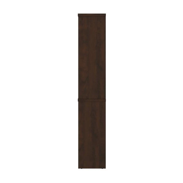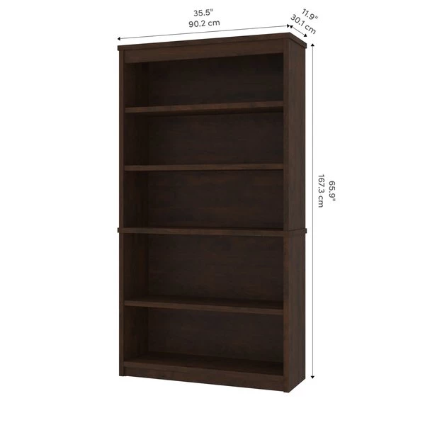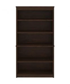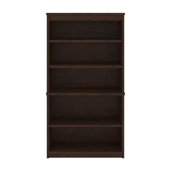 The modular bookcase has 5 shelves, 3 of which are adjustable. It features 2 sections that can be used together or apart. The higher section can be installed on top of lateral file.