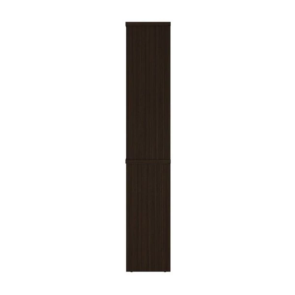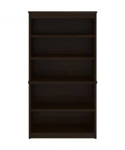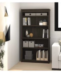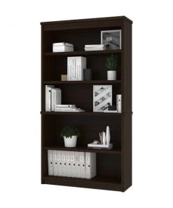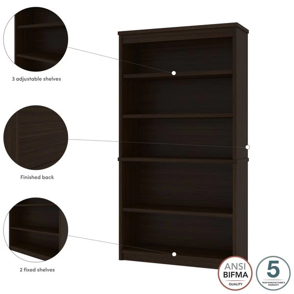 The modular bookcase has 5 shelves, 3 of which are adjustable. It features 2 sections that can be used together or apart. The higher section can be installed on top of lateral file.