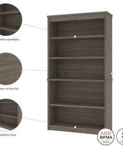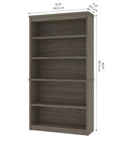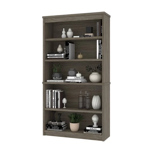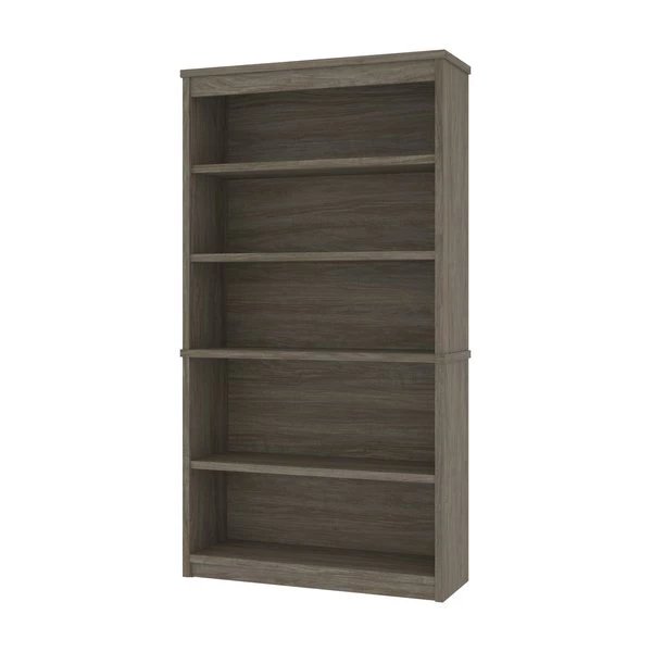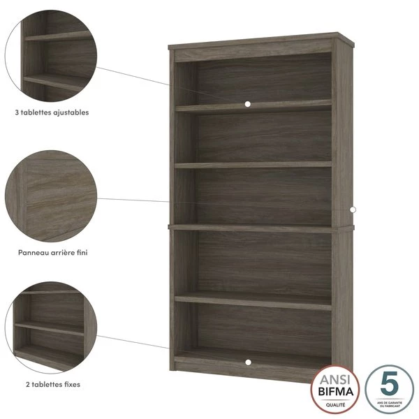 The modular bookcase has 5 shelves, 3 of which are adjustable. It features 2 sections that can be used together or apart. The higher section can be installed on top of lateral file.