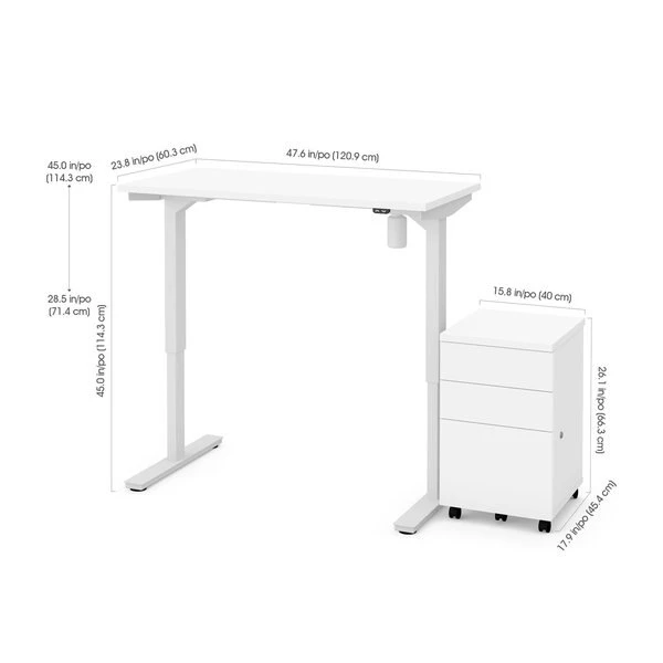 Choose this practical bundle to create an ergonomic office in any small space. The Electric Standing Desk is the perfect solution for workers who love to both sit and stand throughout the day. Easily save your favorite heights and move from one position to the next at the touch of a button. You can place the Mobile Pedestal beneath your desk to save space or roll it around throughout your office as you see fit. Safely store files and important documents in the bottom two drawers, which are lockable. The Mobile Pedestal is assembled.