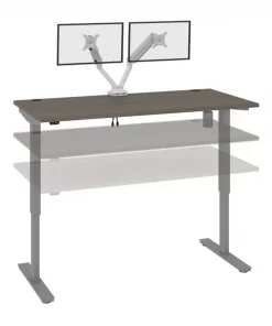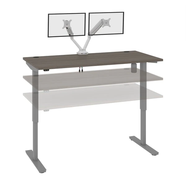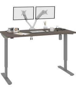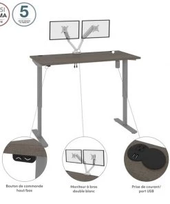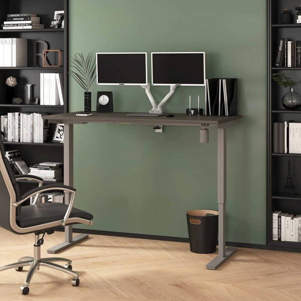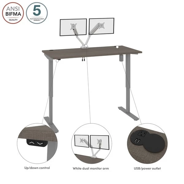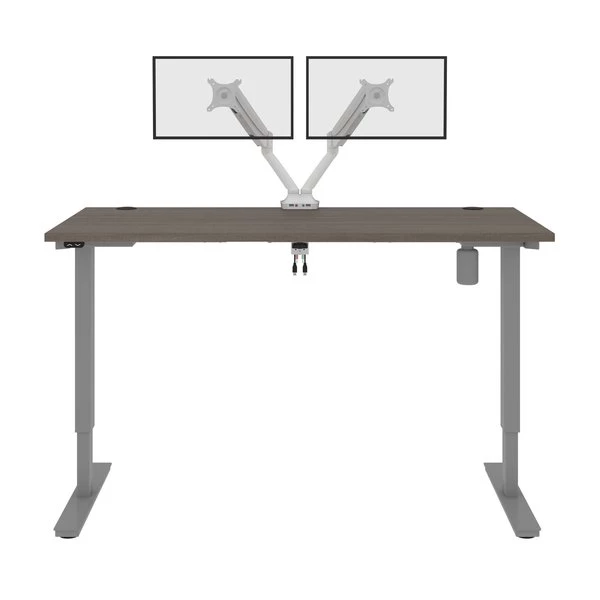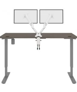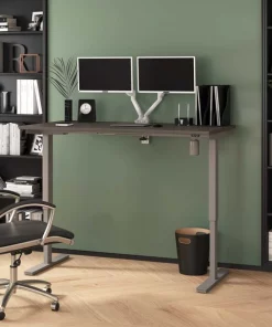 With its minimalist design, this modern Standing Desk will blend in with any decor. A dual power/USB module on the desktop allows you to keep your devices within easy reach and a grommet keeps cables out of sight. The Dual Monitor Arm frees up your work surface and makes space for your material. The spacious desktop provides plenty of room to spread out. Together, the Standing Desk and the Dual Monitor Arm create the perfect ergonomic workstation for your home office or professional workplace.