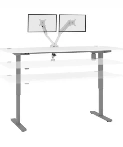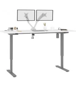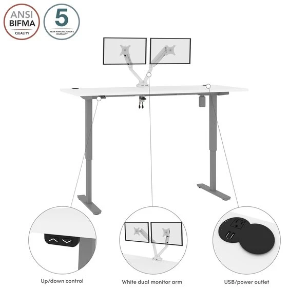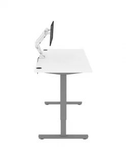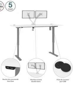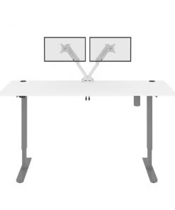 With its minimalist design, this modern Standing Desk will blend in with any decor. A dual power/USB module on the desktop allows you to keep your devices within easy reach and a grommet keeps cables out of sight. The Dual Monitor Arm frees up your work surface and makes space for your material. The spacious desktop provides plenty of room to spread out. Together, the Standing Desk and the Dual Monitor Arm create the perfect ergonomic workstation for your home office or professional workplace. Enjoy a vast work surface that can withstand years of use.