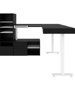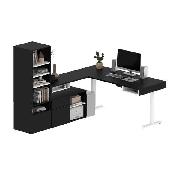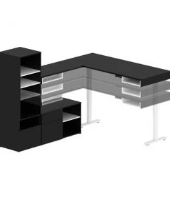 Create two functional workspaces thanks to this modern desk set. The L-Shaped Electric Standing Desks each offer two open compartments to keep small office supplies within reach. With two fixed shelves and three adjustable shelves each, the Shelving Units accommodate items of various sizes and conceal office clutter in their closed compartments. The Credenzas each feature a box drawer for accessories, a file drawer for documents, and one open compartment with an adjustable shelf for books and more.