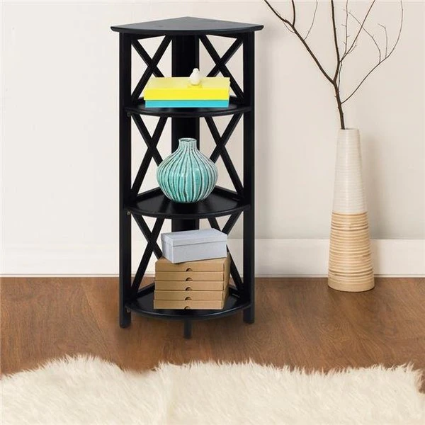 Soft curves meet strong edges in this X-Design 4-Shelf Corner Bookcase. Maximize corner utility in any room in the house. Simplistic foldable design makes it easy to transport or store for any occasion. FeaturesSolid WoodNo Assembly4-tiers to maximize storage and decorative displaysPerfect for books. collectibles and moreConvenient fold-up designSpecificationsColor: BlackMaterial: WoodNumber of Shelves: 4Dimension: 4.25" H x 4.25" W x 13.5" DWeight: 14 lbs