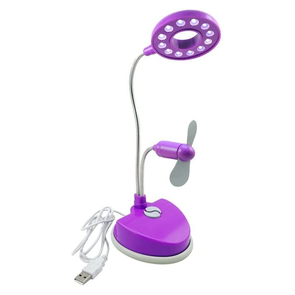 Adjustable light and fan Powered by batteries or USB (cable included) Includes three AAA batteries Stay cool at your home or office. This handy light also includes a powerful fan. Great for hobbies and desks.