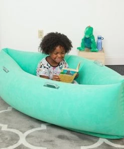 Comfy Hugging Peapod's soothing deep pressure offers a comforting caressing hug, enabling a calming sense of security. Just a few minutes in the Comfy Peapod relaxes, quiets and calms down most kids. Perfect for those who are fidgety and can't sit still to read, study, or just relax. Focus is increased by the soft embrace of the peapod, as the child slips in, relieving anxiety and stress, giving a sense of security, resulting in greater concentration and more attentive behavior when reading, working, and socializing. The soft, durable and easy to use inflatable Comfy Hugging Peapod comes with an electric pump, so it is fast, easy and fun to inflate. Effortlessly inflates and deflates for easy storage.Perfect for School or Home and as it is made with the finest flocked super-strong vinyl with heavy-duty triple-welded seams. Soft like velvet and strong and durable for endless kid's play. Repair kit included. Three inflatable compartments enable kids to rock side to side providing an outlet for excess energy and fostering a sense of calmness. Provides sensory comfort and supports all children including kids with ADHD, autism and sensory processing disorder. Measures 60" x 30" x 17" and holds up to 350 lbs. Ages 6-12, 3-5'1" tall. Latex and phthalate free.