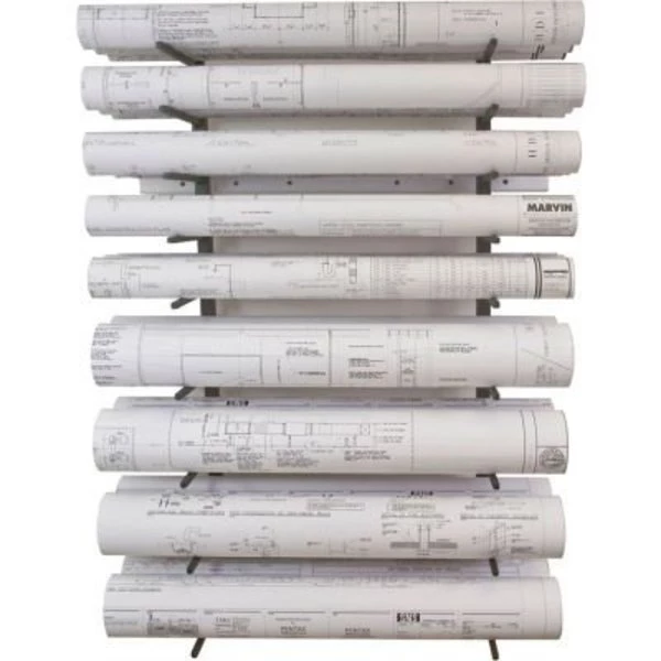 Take advantage of your vertical wall space to organize your blueprints or other large rolled materials. Heavy duty steel frames with welded posts supports up to 320 lbs on our wall mounted racks. Wall mounted racks are 44" tall, 21" wide, 11" deep and attach to wall mounting plates. Bin "posts" are welded at an incline and extend 9" off the frame. Wall brackets with 16" stud spaced mounting holes extend the frame 1-1/4" off the wall to allow space for chair rail is included. Finished in a durable powder coated textured black paint. compact wall mount design saves valuable floor space to store oversized rolled documents heavy duty welded steel frame supports up to 320 lbs of rolled storage material includes wall brackets that extend rack 1-1/4" off the wall to allow for baseboard or chair rail includes four 6" tall bins and four 4" tall bins (openings) overall rack is 44" tall, 21" wide and 11" deep mounting plates are 30" wide x 3-1/2" tall mounting plate holes are pre-drilled to accommodate wall studs 8", 16" or 24" apart steel construction with durable powder coat textured black finish easy assembly