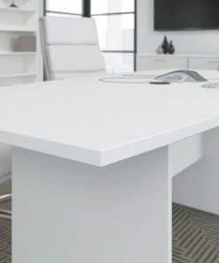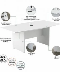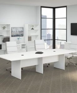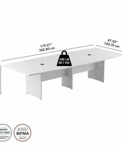 Bring your team together in a private or open plan office with the Bush Business Furniture 120W x 48D Boat Shaped Conference Table. Perfect for medium to large-sized groups, this meeting table provides ample room for 8-10 users to collaborate with laptops, paperwork and other materials. A durable thermally fused laminate work surface with continuous edge banding protects against scratches, stains, nicks and dings throughout years of daily meetings while a finished underside helps prevent snagged clothing. The tabletop also includes two wire management grommets to accommodate cords and cables from a projector or speaker phone. The large conference room table is supported by a sturdy wooden base for a weight capacity of 200 pounds, making it great for use in a training area or education space in addition to the boardroom. Your choice of Natural Maple, Harvest Cherry, Hansen Cherry, Mocha Cherry, Storm Gray, Platinum Gray and White finishes coordinate with a broad selection of commercial-grade chairs, storage and accessories to complete your meeting area. This long office table is tested to meet ANSI/BIFMA quality standards for safety and performance and is backed by a . Bush Business Furniture Conference Tables are available in a variety of styles and sizes to complement any professional environment.