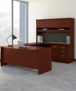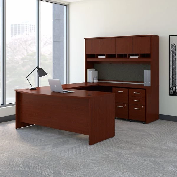 With an inviting Bow Front design, Mobile File Cabinets and a versatile Hutch, this Bush Business Furniture Series C U Shaped Desk gives you the style you want with the functionality you need. Spread out and multitask on the durable thermally fused laminate surfaces with space to spare for guests to pull up chairs and collaborate on the rounded Bow Front Desk. This commercial office furniture combination keeps you organized for years. Track projects on the fabric tack board while placing current assignments in 6 cubby shelves for easy access. Conceal books, binders and office supplies behind 4 Hutch doors, as you roll your files wherever you need them with 2 and 3 Drawer Cabinets. Full-extension file drawers glide on smooth ball bearing slides for an effortless reach to the back. Brushed Nickel hardware and extended modesty panels complete the classic look. The options are endless with Series C. the collection withstands the rigors of a 40-plus hour week. Multiple layout options and 7 finishes meet the needs of numerous workspaces. Series C evolves with your preferences, allowing you to reconfigure your office as required with a complete line of coordinated products.