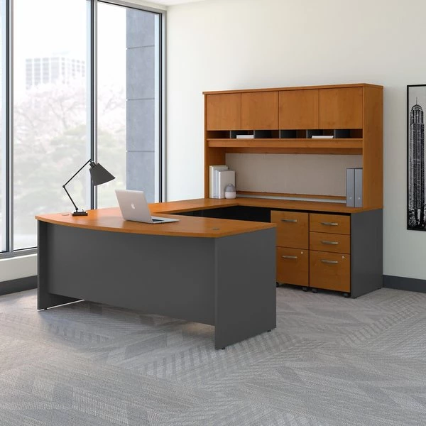 With an inviting Bow Front design, Mobile File Cabinets and a versatile Hutch, this Bush Business Furniture Series C U Shaped Desk gives you the style you want with the functionality you need. Spread out and multitask on the durable thermally fused laminate surfaces with space to spare for guests to pull up chairs and collaborate on the rounded Bow Front Desk. This commercial office furniture combination keeps you organized for years. Track projects on the fabric tack board while placing current assignments in 6 cubby shelves for easy access. Conceal books, binders and office supplies behind 4 Hutch doors, as you roll your files wherever you need them with 2 and 3 Drawer Cabinets. Full-extension file drawers glide on smooth ball bearing slides for an effortless reach to the back. Brushed Nickel hardware and extended modesty panels complete the classic look. The options are endless with Series C. the collection withstands the rigors of a 40-plus hour week. Multiple layout options and 7 finishes meet the needs of numerous workspaces. Series C evolves with your preferences, allowing you to reconfigure your office as required with a complete line of coordinated products.