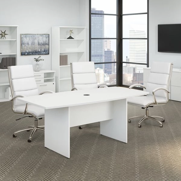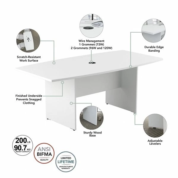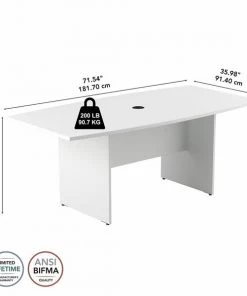 Bring your team together in a private or open plan office with the Bush Business Furniture 72W x 36D Boat Shaped Conference Table. Perfect for small to medium-sized groups, this meeting table provides ample room for 4-6 users to collaborate with laptops, paperwork and other materials. A durable thermally fused laminate work surface with continuous edge banding protects against scratches, stains, nicks and dings throughout years of daily meetings while a finished underside helps prevent snagged clothing. The tabletop also includes a central wire management grommet to accommodate cords and cables from a projector or speaker phone. The large conference room table is supported by a sturdy wooden base for a weight capacity of 200 pounds, making it great for use in a training area or education space in addition to the boardroom. Your choice of Natural Maple, Harvest Cherry, Hansen Cherry, Mocha Cherry, Storm Gray, Platinum Gray and White finishes coordinate with a broad selection of commercial-grade chairs, storage and accessories to complete your meeting area. This long office table is tested to meet ANSI/BIFMA quality standards for safety and performance and is backed by a . Bush Business Furniture Conference Tables are available in a variety of styles and sizes to complement any professional environment.