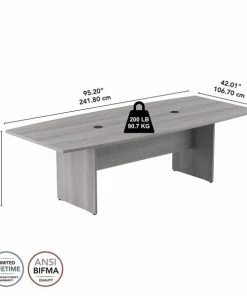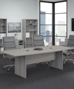 Bring your team together in a private or open plan office with the Bush Business Furniture 96W x 42D Boat Shaped Conference Table. Perfect for medium to large-sized groups, this meeting table provides ample room for 6-8 users to collaborate with laptops, paperwork and other materials. A durable thermally fused laminate work surface with continuous edge banding protects against scratches, stains, nicks and dings throughout years of daily meetings while a finished underside helps prevent snagged clothing. The tabletop also includes two wire management grommets to accommodate cords and cables from a projector or speaker phone. The large conference room table is supported by a sturdy wooden base for a weight capacity of 200 pounds, making it great for use in a training area or education space in addition to the boardroom. Your choice of Natural Maple, Harvest Cherry, Hansen Cherry, Mocha Cherry, Storm Gray, Platinum Gray and White finishes coordinate with a broad selection of commercial-grade chairs, storage and accessories to complete your meeting area. This long office table is tested to meet ANSI/BIFMA quality standards for safety and performance and is backed by a . Bush Business Furniture Conference Tables are available in a variety of styles and sizes to complement any professional environment.