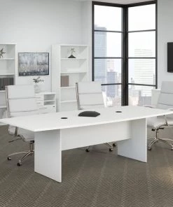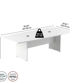 Bring your team together in a private or open plan office with the Bush Business Furniture 96W x 42D Boat Shaped Conference Table. Perfect for medium to large-sized groups, this meeting table provides ample room for 6-8 users to collaborate with laptops, paperwork and other materials. A durable thermally fused laminate work surface with continuous edge banding protects against scratches, stains, nicks and dings throughout years of daily meetings while a finished underside helps prevent snagged clothing. The tabletop also includes two wire management grommets to accommodate cords and cables from a projector or speaker phone. The large conference room table is supported by a sturdy wooden base for a weight capacity of 200 pounds, making it great for use in a training area or education space in addition to the boardroom. Your choice of Natural Maple, Harvest Cherry, Hansen Cherry, Mocha Cherry, Storm Gray, Platinum Gray and White finishes coordinate with a broad selection of commercial-grade chairs, storage and accessories to complete your meeting area. This long office table is tested to meet ANSI/BIFMA quality standards for safety and performance and is backed by a . Bush Business Furniture Conference Tables are available in a variety of styles and sizes to complement any professional environment.