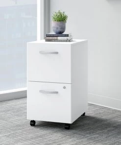 The Bush Business Furniture Easy Office 2 Drawer Mobile File Cabinet presents an ideal solution for adding storage to any professional workplace. With its dual-wheeled casters and finished back, the portable File Cabinet provides convenient access to legal, letter and A4-size paperwork anywhere in your office. Drawers open on smooth full-extension ball bearing slides for an effortless reach to contents and can be locked to securely store documents with sensitive information. Find the perfect look for any office environment with traditional Mocha Cherry and contemporary Pure White finish options, both of which feature stylish Brushed Nickel drawer pulls. This locking File Cabinet is tested to meet ANSI/BIFMA quality standards for safety and performance. See the complete Easy Office Collection for coordinating items to get your workspace up and running in no time, including Cubicle Desk Workstations and additional storage.