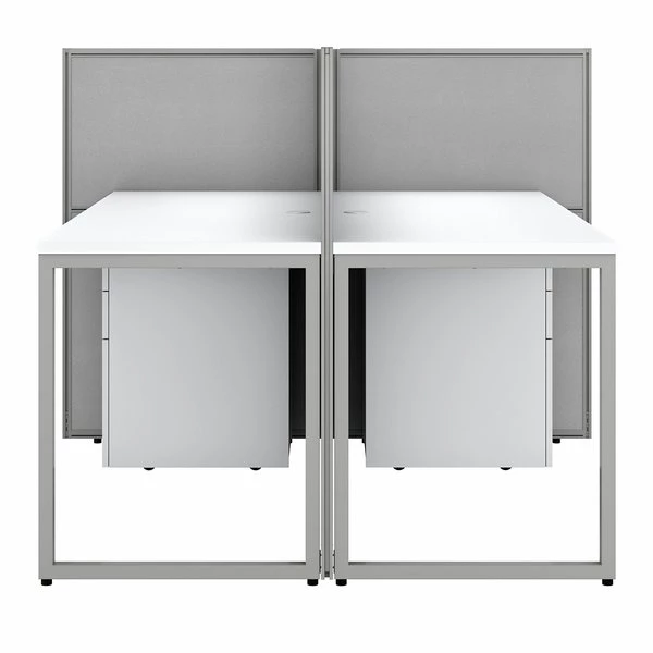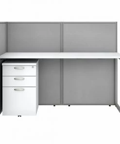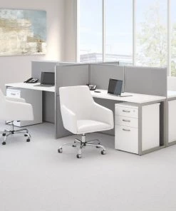 Enjoy a private, productive workspace for two designed with quality and convenience in mind. The Bush Business Furniture Easy Office 60W 2 Person Cubicle Desk with File Cabinets and 45H Panels offers a simple configuration that can be set up quickly, yet is durable enough to withstand the rigors of everyday use in a fast-paced professional environment. The matching 60W x 24D work surfaces provide plenty of room to spread out with materials while built-in wire management grommets keep cords and cables out of the way. The one-inch thick desktops support up to 200 pounds each and have a thermally fused laminate finish that protects against normal wear and tear. Low 45H Panels cover the front and one side of the Desks in a T formation to maintain privacy and enhance focus while still allowing for communication between team members. Two Filing Cabinets roll on dual-wheeled casters and fit under the Desks for convenient storage of legal, letter and A4-size documents along with miscellaneous supplies. Drawers open on smooth full-extension ball bearing slides, and the top drawer can be locked to secure valuable items. Your choice of attractive Mocha Cherry and Pure White finishes are complemented by contemporary fabric Panels for a professional appearance that suits virtually any workplace. This commercial office furniture set is tested to meet ANSI/BIFMA quality standards for safety and performance.
