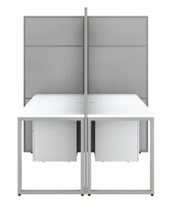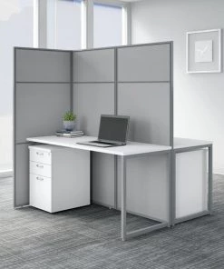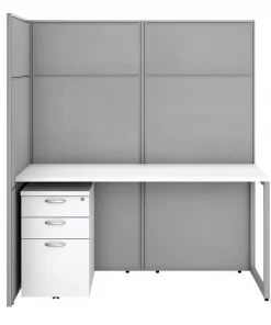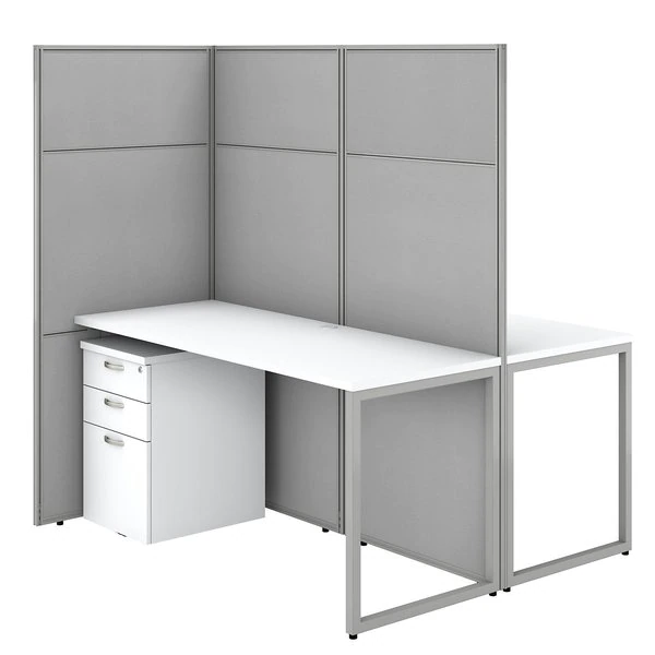 Enjoy a private, productive workspace for two designed with quality and convenience in mind. The Bush Business Furniture Easy Office 60W 2 Person Cubicle Desk with File Cabinets and 66H Panels offers a simple configuration that can be set up quickly, yet is durable enough to withstand the rigors of everyday use in a fast-paced professional environment. The matching 60W x 24D work surfaces provide plenty of room to spread out with materials while built-in wire management grommets keep cords and cables out of the way. The one-inch thick desktops support up to 200 pounds each and have a thermally fused laminate finish that protects against normal wear and tear. Extended 66H Panels cover the front and one side of the Desks in a T formation to maintain privacy and enhance focus by eliminating visual distractions. Two Filing Cabinets roll on dual-wheeled casters and fit under the Desks for convenient storage of legal, letter and A4-size documents along with miscellaneous supplies. Drawers open on smooth full-extension ball bearing slides, and the top drawer can be locked to secure valuable items. Your choice of attractive Mocha Cherry and Pure White finishes are complemented by contemporary fabric Panels for a professional appearance that suits virtually any workplace. This commercial office furniture set is tested to meet ANSI/BIFMA quality standards for safety and performance.