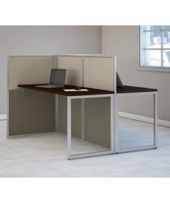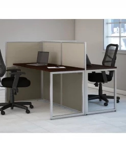 Enjoy a private, productive workspace for two designed with quality and convenience in mind. The Bush Business Furniture Easy Office 60W 2 Person Cubicle Desk Workstation with 45H Panels offers a simple configuration that can be set up quickly, yet is durable enough to withstand the rigors of everyday use in a fast-paced professional environment. The matching 60W x 24D desktops provide plenty of room to spread out with materials while built-in wire management grommets keep unsightly cords and cables out of the way while you work. The one-inch thick surfaces are able to support up to 200 pounds each and feature a thermally fused laminate finish that protects against normal wear and tear. Low 45H Cubicle Panels cover the front and one side of the Desks in a T formation to maintain privacy and enhance focus while still allowing for communication between team members. Metal desk legs and the base of the Privacy Panels include adjustable levelers to compensate for uneven floors. Your choice of attractive Mocha Cherry and Pure White finishes are complemented by contemporary fabric Panels for a professional appearance that suits virtually any workplace. This commercial office desk set is tested to meet ANSI/BIFMA quality standards for safety and performance. Expand your workspace as needed with Easy Office's broad range of coordinating storage solutions (sold separately).
