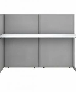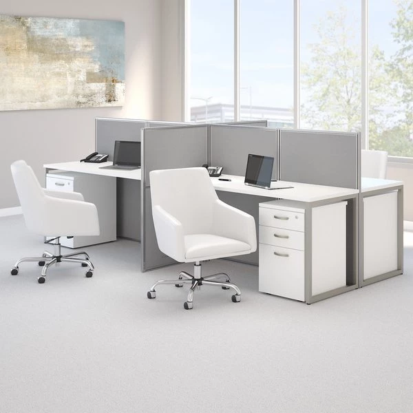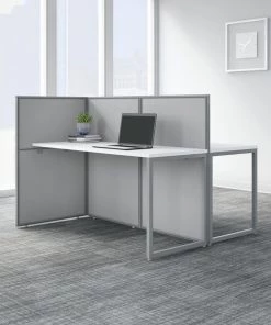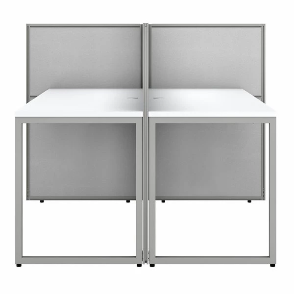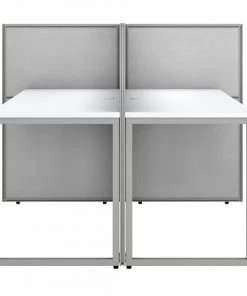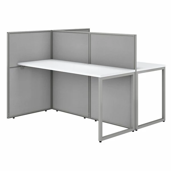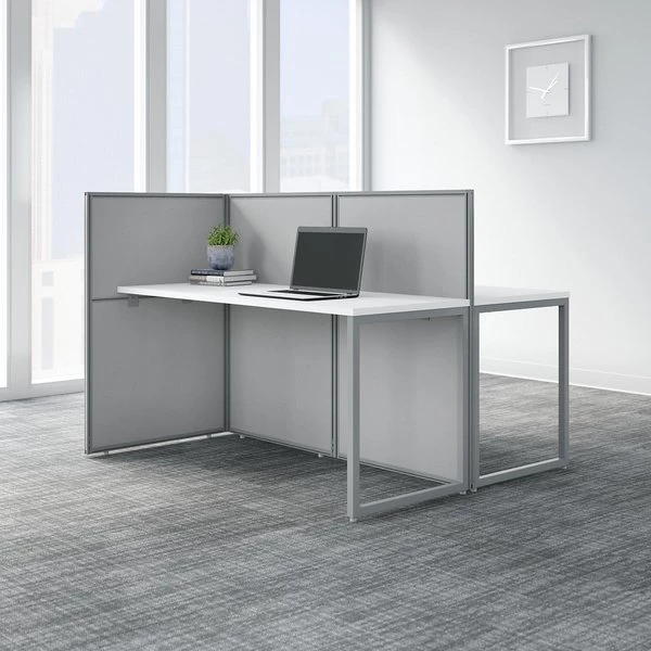 Enjoy a private, productive workspace for two designed with quality and convenience in mind. The Bush Business Furniture Easy Office 60W 2 Person Cubicle Desk Workstation with 45H Panels offers a simple configuration that can be set up quickly, yet is durable enough to withstand the rigors of everyday use in a fast-paced professional environment. The matching 60W x 24D desktops provide plenty of room to spread out with materials while built-in wire management grommets keep unsightly cords and cables out of the way while you work. The one-inch thick surfaces are able to support up to 200 pounds each and feature a thermally fused laminate finish that protects against normal wear and tear. Low 45H Cubicle Panels cover the front and one side of the Desks in a T formation to maintain privacy and enhance focus while still allowing for communication between team members. Metal desk legs and the base of the Privacy Panels include adjustable levelers to compensate for uneven floors. Your choice of attractive Mocha Cherry and Pure White finishes are complemented by contemporary fabric Panels for a professional appearance that suits virtually any workplace. This commercial office desk set is tested to meet ANSI/BIFMA quality standards for safety and performance. Expand your workspace as needed with Easy Office's broad range of coordinating storage solutions (sold separately).
