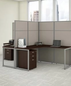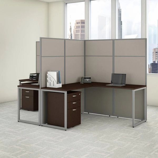 Enjoy a private, productive workspace for two designed with quality and convenience in mind. The Bush Business Furniture Easy Office 60W 2 Person L Shaped Cubicle Desk with Drawers and 66H Panels offers a simple configuration that can be set up quickly, yet is durable enough to withstand the rigors of everyday use in a fast-paced professional environment. Matching 60W x 24D Office Desks and 36W x 24D Returns connect to form spacious right or left handed work surfaces with built-in wire management to keep cords out of the way. The one-inch thick desktops support up to 200 pounds each and have a thermally fused laminate finish that protects against normal wear and tear. Extended 66H Panels separate the L Desks to maintain privacy and enhance focus by eliminating visual distractions. Two 3 Drawer Filing Cabinets roll on dual-wheeled casters and fit under the Desks for convenient storage of legal, letter and A4-size documents along with miscellaneous supplies. Drawers open on smooth full-extension ball bearing slides, and the top drawer can be locked to keep valuable items safe and secure. Your choice of attractive Mocha Cherry and Pure White finishes are complemented by contemporary fabric Panels for a professional appearance that suits virtually any workplace. This commercial office furniture set is tested to meet ANSI/BIFMA quality standards for safety and performance.