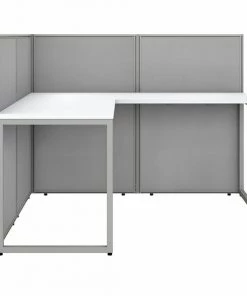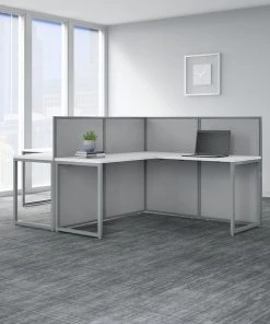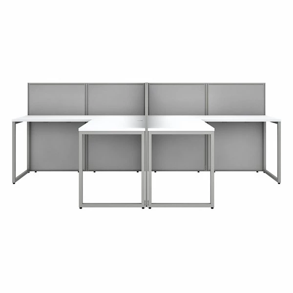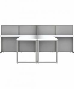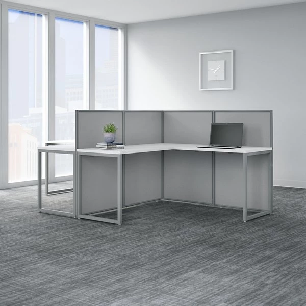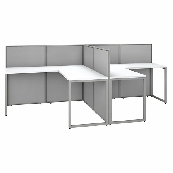 Enjoy a private, productive workspace for two designed with quality and convenience in mind. The Bush Business Furniture Easy Office 60W 2 Person L Shaped Cubicle Desk Workstation with 45H Panels offers a simple configuration that can be set up quickly, yet is durable enough to withstand the rigors of everyday use in a fast-paced professional environment. Matching 60W x 24D Office Desks and 36W x 24D Desk Returns connect to form spacious right or left handed work surfaces with built-in wire management to keep unsightly cords and cables out of the way. The one-inch thick desktops are able to support up to 200 pounds each and feature a thermally fused laminate finish that protects against normal wear and tear. Low 45H Cubicle Panels separate the L Desks to maintain privacy and enhance focus while still allowing for communication between team members. Metal desk legs and the base of the Privacy Panels include adjustable levelers to compensate for uneven floors. Your choice of attractive Mocha Cherry and Pure White finishes are complemented by contemporary fabric Panels for a professional appearance that suits virtually any workplace. This commercial office furniture set is tested to meet ANSI/BIFMA quality standards for safety and performance. Expand your workspace as needed with Easy Office's broad range of coordinating storage solutions (sold separately).