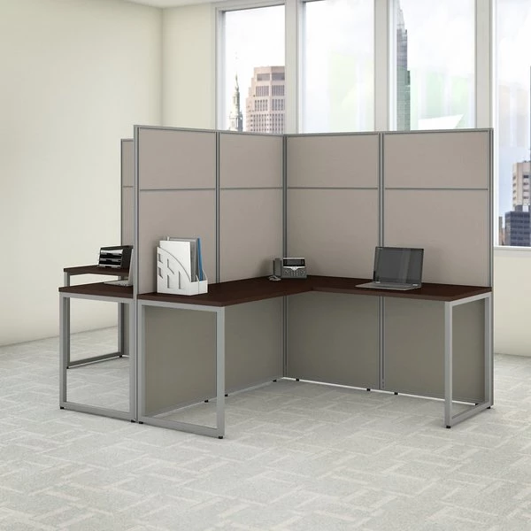 Enjoy a private, productive workspace for two designed with quality and convenience in mind. The Bush Business Furniture Easy Office 60W 2 Person L Shaped Cubicle Desk Workstation with 66H Panels offers a simple configuration that can be set up quickly, yet is durable enough to withstand the rigors of everyday use in a fast-paced professional environment. Matching 60W x 24D Office Desks and 36W x 24D Desk Returns connect to form spacious right or left handed work surfaces with built-in wire management to keep unsightly cords and cables out of the way. The one-inch thick desktops are able to support up to 200 pounds each and feature a thermally fused laminate finish that protects against normal wear and tear. Extended 66H Cubicle Panels separate the L Desks to maintain privacy and enhance focus by eliminating visual distractions in open plan offices. Metal desk legs and the base of the Privacy Panels include adjustable levelers to compensate for uneven floors. Your choice of attractive Mocha Cherry and Pure White finishes are complemented by contemporary fabric Panels for a professional appearance that suits virtually any workplace. This commercial office furniture set is tested to meet ANSI/BIFMA quality standards for safety and performance. Expand your workspace as needed with Easy Office's broad range of coordinating storage solutions (sold separately).