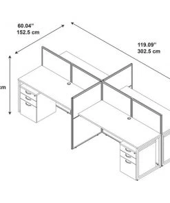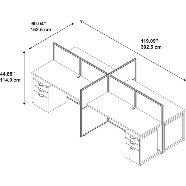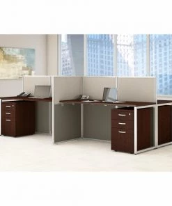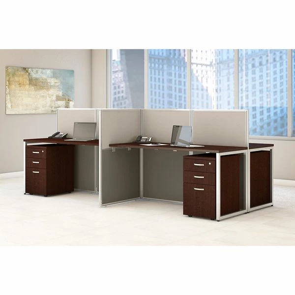 Enjoy a private, productive workspace for four designed with quality and convenience in mind. The Bush Business Furniture Easy Office 60W 4 Person Desk with File Cabinets and 45H Cubicle Panels offers a simple configuration that can be set up quickly, yet is durable enough to withstand the rigors of everyday use in a fast-paced professional environment. The matching 60W x 24D work surfaces provide plenty of room to spread out with materials while built-in wire management grommets keep cords and cables out of the way. The one-inch thick desktops support up to 200 pounds each and have a thermally fused laminate finish that protects against normal wear and tear. Low 45H Panels separate the Desks in an X formation to maintain privacy and enhance focus while still allowing for communication between team members. Four 3 Drawer Filing Cabinets roll on dual-wheeled casters and fit under the Desks for convenient storage of legal, letter and A4-size documents along with miscellaneous supplies. Drawers open on smooth full-extension ball bearing slides, and the top drawer can be locked to secure valuable items. Your choice of attractive Mocha Cherry and Pure White finishes are complemented by contemporary fabric Panels for a professional appearance that suits virtually any workplace. This commercial office furniture set is tested to meet ANSI/BIFMA quality standards for safety and performance.