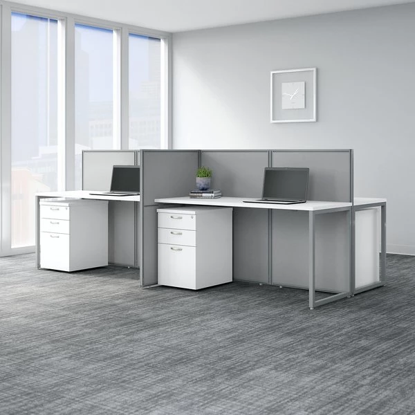 Enjoy a private, productive workspace for four designed with quality and convenience in mind. The Bush Business Furniture Easy Office 60W 4 Person Desk with File Cabinets and 45H Cubicle Panels offers a simple configuration that can be set up quickly, yet is durable enough to withstand the rigors of everyday use in a fast-paced professional environment. The matching 60W x 24D work surfaces provide plenty of room to spread out with materials while built-in wire management grommets keep cords and cables out of the way. The one-inch thick desktops support up to 200 pounds each and have a thermally fused laminate finish that protects against normal wear and tear. Low 45H Panels separate the Desks in an X formation to maintain privacy and enhance focus while still allowing for communication between team members. Four 3 Drawer Filing Cabinets roll on dual-wheeled casters and fit under the Desks for convenient storage of legal, letter and A4-size documents along with miscellaneous supplies. Drawers open on smooth full-extension ball bearing slides, and the top drawer can be locked to secure valuable items. Your choice of attractive Mocha Cherry and Pure White finishes are complemented by contemporary fabric Panels for a professional appearance that suits virtually any workplace. This commercial office furniture set is tested to meet ANSI/BIFMA quality standards for safety and performance.