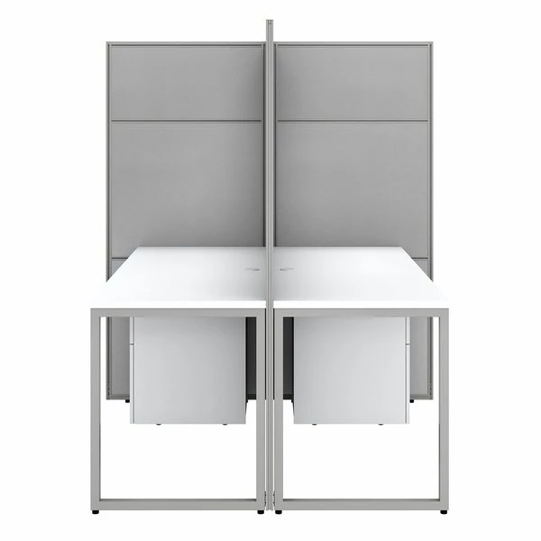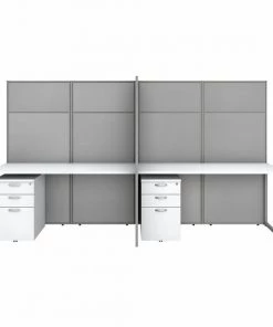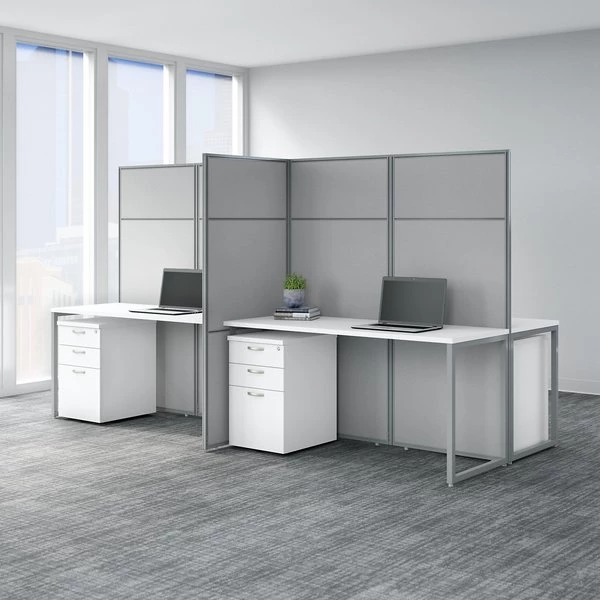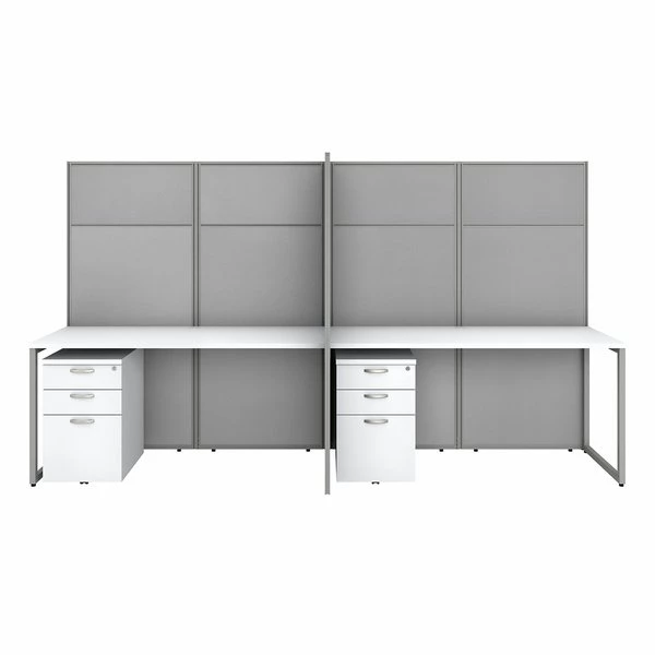 Enjoy a private, productive workspace for four designed with quality and convenience in mind. The Bush Business Furniture Easy Office 60W 4 Person Desk with File Cabinets and 66H Cubicle Panels offers a simple configuration that can be set up quickly, yet is durable enough to withstand the rigors of everyday use in a fast-paced professional environment. The matching 60W x 24D work surfaces provide plenty of room to spread out with materials while built-in wire management grommets keep cords and cables out of the way. The one-inch thick desktops support up to 200 pounds each and have a thermally fused laminate finish that protects against normal wear and tear. Extended 66H Panels separate the Desks in an X formation to maintain privacy and enhance focus by eliminating visual distractions. Four 3 Drawer Filing Cabinets roll on dual-wheeled casters and fit under the Desks for convenient storage of legal, letter and A4-size documents along with miscellaneous supplies. Drawers open on smooth full-extension ball bearing slides, and the top drawer can be locked to secure valuable items. Your choice of attractive Mocha Cherry and Pure White finishes are complemented by contemporary fabric Panels for a professional appearance that suits virtually any workplace. This commercial office furniture set is tested to meet ANSI/BIFMA quality standards for safety and performance.