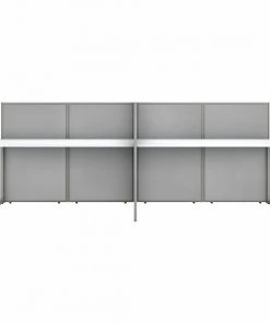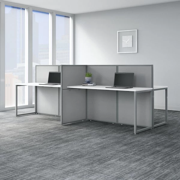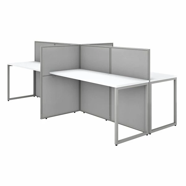 Enjoy a private, productive workspace for four designed with quality and convenience in mind. The Bush Business Furniture Easy Office 60W 4 Person Cubicle Desk Workstation with 45H Panels offers a simple configuration that can be set up quickly, yet is durable enough to withstand the rigors of everyday use in a fast-paced professional environment. The matching 60W x 24D desktops provide plenty of room to spread out with materials while built-in wire management grommets keep unsightly cords and cables out of the way as you work. The one-inch thick surfaces are able to support up to 200 pounds each and feature a thermally fused laminate finish that protects against normal wear and tear. Low 45H Cubicle Panels separate the Desks in an X formation to maintain privacy and enhance focus while still allowing for communication between team members. Metal desk legs and the base of the Privacy Panels include adjustable levelers to compensate for uneven floors. Your choice of attractive Mocha Cherry and Pure White finishes are complemented by contemporary fabric Panels for a professional appearance that suits virtually any workplace. This commercial office furniture set is tested to meet ANSI/BIFMA quality standards for safety and performance. Expand your workspace as needed with Easy Office's broad range of coordinating storage solutions (sold separately).