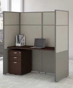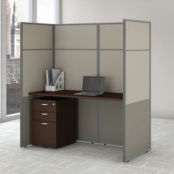 Enjoy a private, productive workspace designed with quality and convenience in mind. The Bush Business Furniture Easy Office 60W Cubicle Desk with File Cabinet and 66H Closed Panels Workstation offers a simple configuration that can be set up quickly, yet is durable enough to withstand the rigors of everyday use in a fast-paced professional environment. The 60W x 24D desktop provides plenty of room to spread out with materials while a built-in wire management grommet keeps cords and cables out of the way while you work. The one-inch thick surface supports up to 200 pounds and has a thermally fused laminate finish that protects it from normal wear and tear. Extended 66H Panels cover the front and both sides of the Desk to maintain privacy and enhance focus by eliminating visual distractions. The 3 Drawer Filing Cabinet rolls on dual-wheeled casters and fits under the Desk for convenient storage of legal, letter and A4-size documents along with various supplies. All three drawers open on smooth full-extension ball bearing slides, and the top drawer can be locked to keep valuable items safe and secure. Your choice of attractive Mocha Cherry and Pure White finishes are complemented by contemporary fabric Panels for a professional appearance that suits virtually any workplace. This commercial office furniture set is tested to meet ANSI/BIFMA quality standards for safety and performance.
