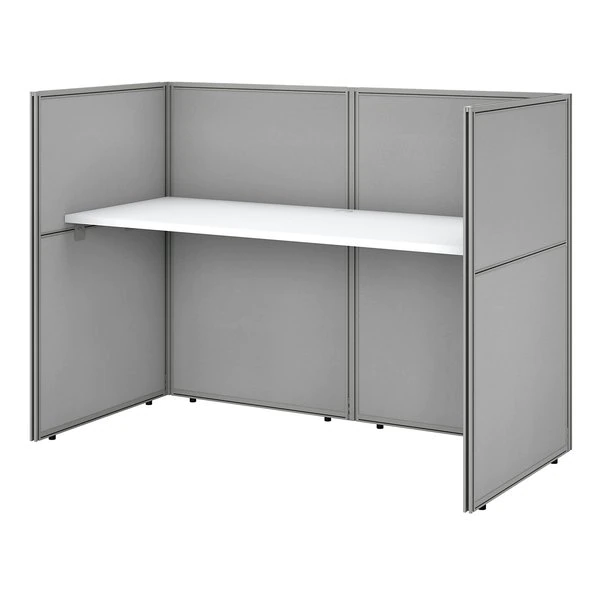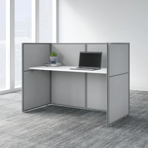 Enjoy a private, productive workspace designed with quality and convenience in mind. The Bush Business Furniture Easy Office 60W Cubicle Desk Workstation with 45H Closed Panels offers a simple configuration that can be set up quickly, yet is durable enough to withstand the rigors of everyday use in a fast-paced professional environment. The 60W x 24D desktop provides plenty of room to spread out with materials while a built-in wire management grommet keeps unsightly cords and cables out of the way while you work. The one-inch thick surface is able to support up to 200 pounds and features a thermally fused laminate finish that protects it from normal wear and tear. Low 45H Cubicle Panels cover the front and both sides of the Desk to maintain privacy and enhance focus while still allowing for communication between team members. Both the Desk's metal legs and the base of the Privacy Panels include adjustable levelers to compensate for uneven floors. Your choice of attractive Mocha Cherry and Pure White finishes are complemented by contemporary fabric Panels for a professional appearance that suits virtually any workplace. This commercial office desk set is tested to meet ANSI/BIFMA quality standards for safety and performance. Expand your workspace as needed with Easy Office's broad range of coordinating storage solutions (sold separately).