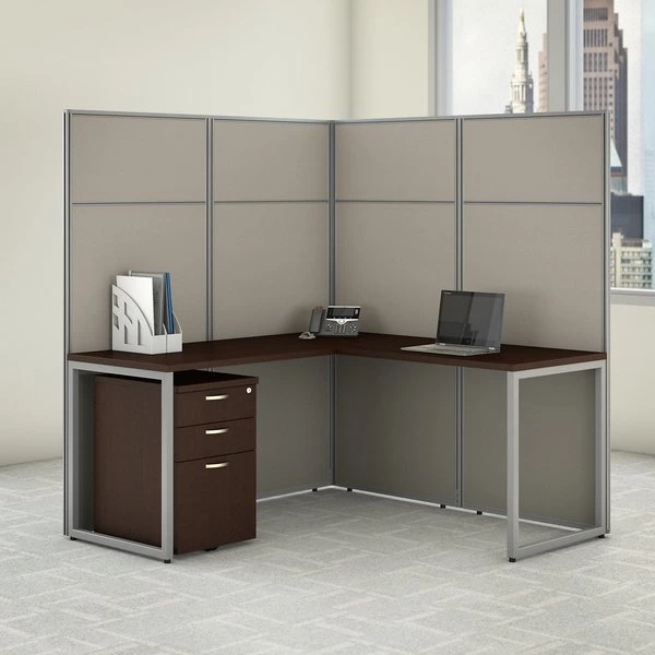 Enjoy a private, productive workspace designed with quality and convenience in mind. The Bush Business Furniture Easy Office 60W L Shaped Cubicle Desk with File Cabinet and 66H Panels offers a simple configuration that can be set up quickly, yet is durable enough to withstand the rigors of everyday use in a fast-paced professional environment. A 60W x 24D Office Desk and 36W x 24D Return connect to form a spacious right or left handed work surface with built-in wire management to keep cords and cables out of the way. The one-inch thick desktop supports up to 200 pounds and has a thermally fused laminate finish that protects it from normal wear and tear. Extended 66H Panels cover the front of the L Desk to maintain privacy and enhance focus by eliminating visual distractions. The 3 Drawer Filing Cabinet rolls on dual-wheeled casters and fits under the Desk for convenient storage of legal, letter and A4-size documents along with miscellaneous supplies. All three drawers open on smooth full-extension ball bearing slides, and the top drawer can be locked to keep valuable items safe and secure. Your choice of attractive Mocha Cherry and Pure White finishes are complemented by contemporary fabric Panels for a professional appearance that suits virtually any workplace. This commercial office furniture set is tested to meet ANSI/BIFMA quality standards for safety and performance.